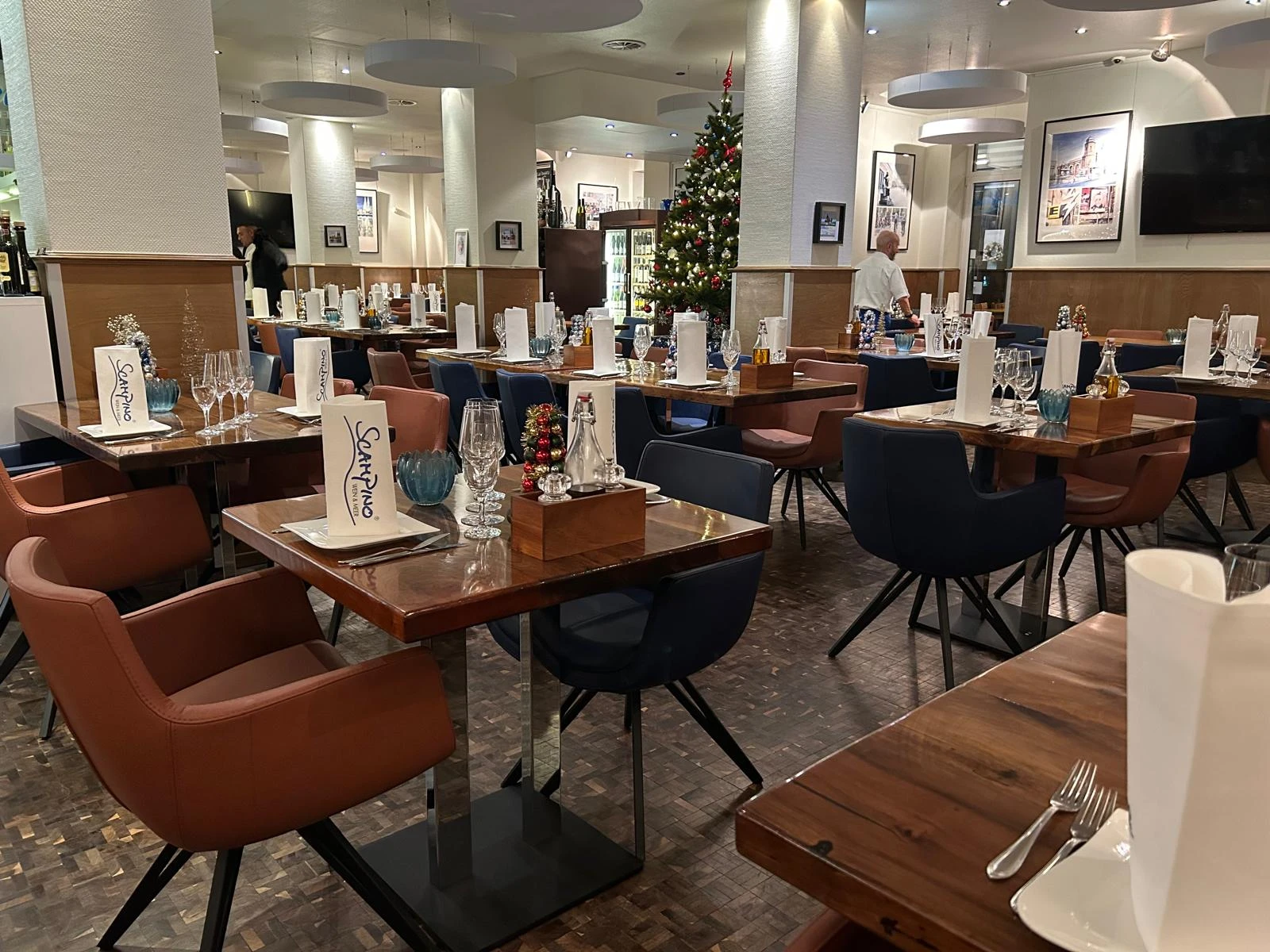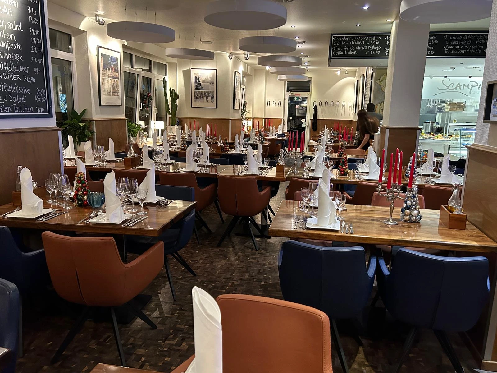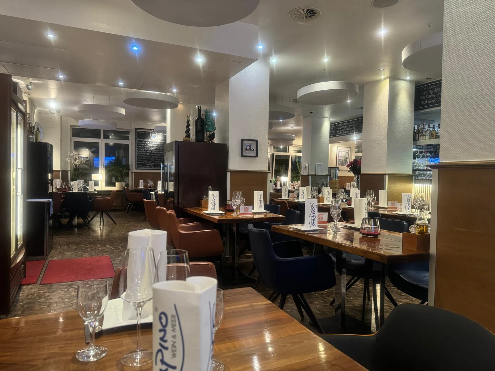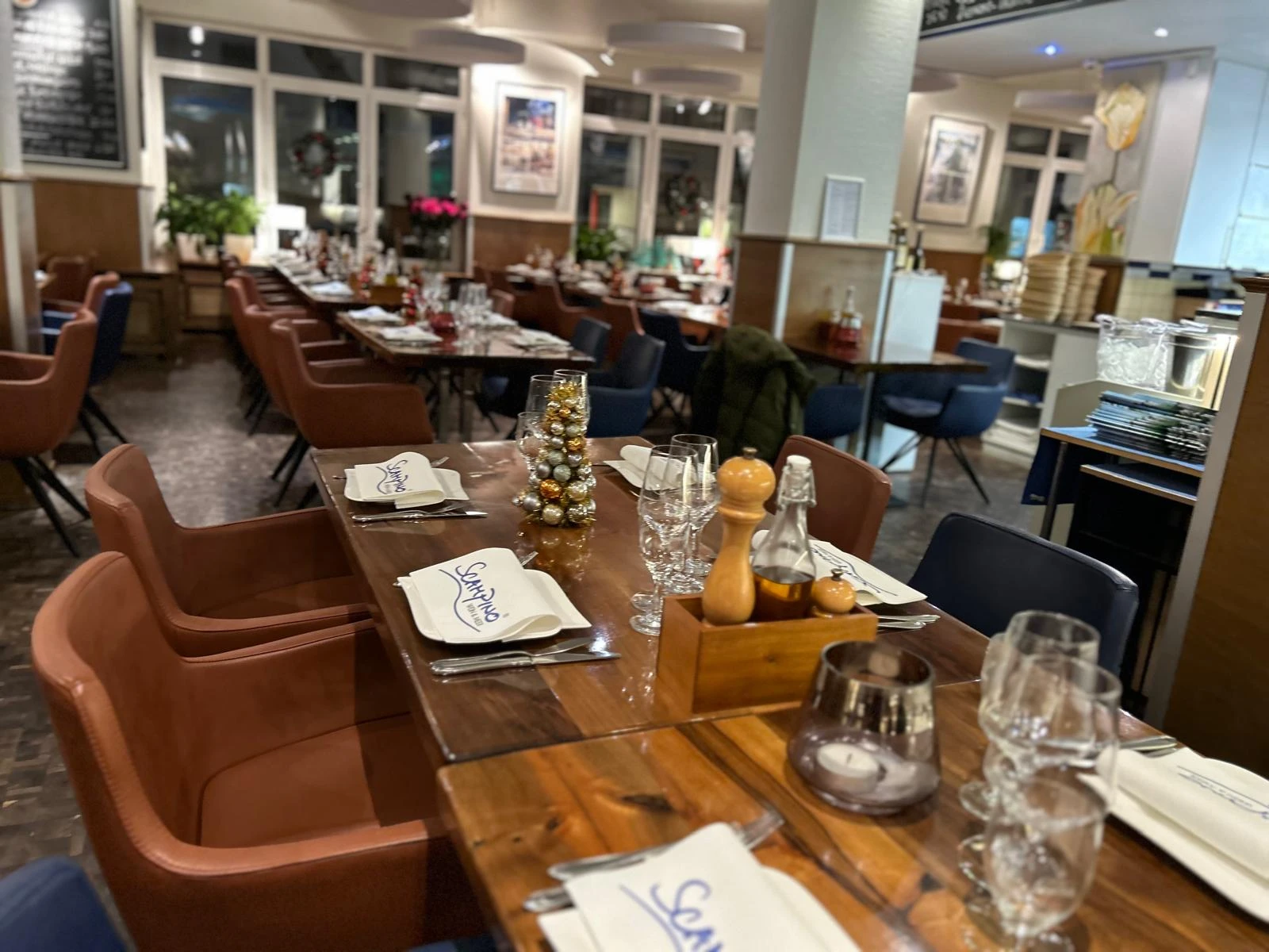 Unsere Räumlichkeiten vereinen warme Holzakzente, elegante Stoffe und maritimes Flair. Ob Sie einen ruhigen Tisch am Fenster oder Platz für eine Gruppe suchen – das Scampino bietet den idealen Rahmen für jeden Anlass.